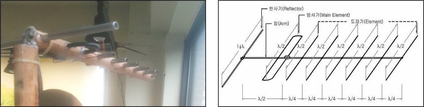 최근 다른 나라 유튜버들이 많이들 제작하는 안테나인데, Yagi 안테나의 변형으로 이런 모양 외에도 PCB 동박을 이용한 방식도 있고, 재질과 모양이 다양한 안테나에 한 종류이다.