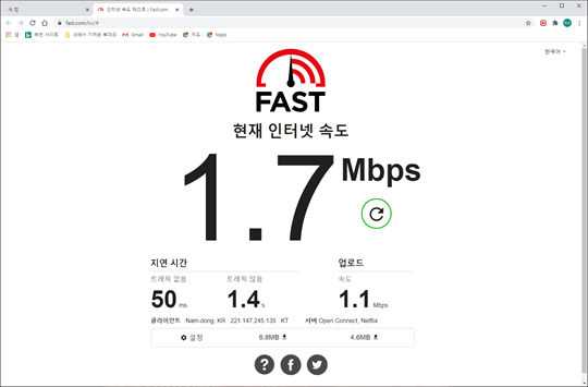 현재 속도는 공유기 설정에서 멀티 브릿지로 연결해 사용 중이고 이 정도면 유튜브 시청, 인터넷 검색, 인터넷 뱅킹 정도는 무난히 사용된다. 단지 큰 파일 다운로드는 좀 어렵다. 아마도 과거 PSTN 모뎀을 사용하던 시기 14,400 bps 속도 정도라고 하면 나와 비슷한 연배는 느낌적인 느낌 알 듯도 싶다.