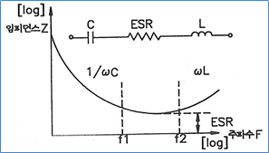 위에서 그림은 커패시터의 임피던스 Z와 주파수 F의 특성을 나타내는 그래프이다. f1 이하 대역은 1/ωC에 의하여 임피던스 Z가 저하하는 부분이고, f1~f2 대역은 ESR에 이해 형성되는 임피던스, 그리고 f2 이상 대역은 ωL에 의하여 임피던스 Z가 상승하는 부분이다. 우리가 전해콘덴서를 추가하여 리플을 제거하고자 한다면 f1~f2 대역 사이에서 제일 낮은 ESR 값이 적용되도록 리플의 주파수가 그 사이에 있어야 한다. 그보다 작거나 큰 대역에서 사용한다면 ESR 저항은 실제보다 큰 값으로 작용한다. 예를 들어 상용 전압을 트랜스를 거쳐 필요 전압으로 뽑아내고 반파 또는 전파 정류를 한 이후 평활용 전해콘덴서를 적용했다면 약 60~120Hz 이내에 들어갈 것이고, 그래프 상 f1이하 대역에 포함될 것이다. 이런 경우 그 회로에서는 예상치 못한 문제점이 발생할 수 있다.