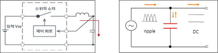 일반적으로 스위칭 레귤레이터의 기본회로를 보면 오른쪽 맨 마지막은 평활용 콘덴서를 사용하게 되는데, 여기서 인덕터를 지난 곳에 파형은 오른쪽 파형처럼 리플이 섞여있는 파형이 관측되고 이 성분은 커패시터의 충방전 전류가 흐르면서 결국은 리플 전류가 GND로 빠져나가 결국엔 리플 파형이 제거된 DC 형태의 파형이 얻어지게 된다. 여기서 중요한 점은 리플 전류가 결국 GND로 흘러간다는 것이다. 리플 전원이 항상 생성되는 곳이기 때문에 리플 전류 또한 회로가 동작되는 한 항상 전류가 흐르게 되는데, 이때 소모되는 전력량[W]은 I 2 (전류) x R(저항)으로 계산해 볼 때 전류는 리플 전압 크기에 종속되지만 저항은 더 작은 것으로 선택이 가능하다는 원리가 생성된다. 결국 저항을 줄임으로써 그 부품에 발열량을 줄일 수 있다는 것이다. 결국은 높은 저항과 전류에 의해 부품에 누적되는 발열량이 다르다는 것이고 또 부품 수명에도 상관이 있다는 것이다.