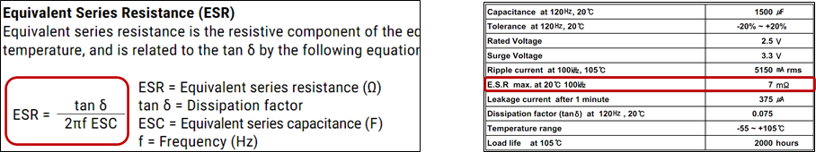 주파수가 있는 조건에서 존재하는 저항 성분이다. 유전체의 특성에 의존하는데 유전체의 두께가 증가하면 그 ESR 은 증가하고, 전극 표면이 증가하면 ESR 값이 감소된다. 부품의 크기를 무한정 크게 만들 수 없는 환경을 고려해 본다면 알루미늄판 등 두 개의 금속판을 절연을 유지하면서 둘둘 말아서 제조하는 콘덴서의 특성상 용량 값이 큰 부품일수록 ESR 값이 더 커질 수 있다는 것이다.